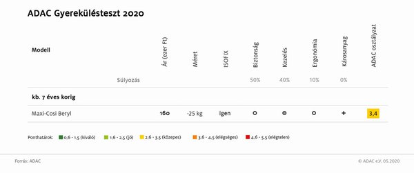 Mindössze egy terméket vizsgáltak a hétéves korig ajánlott ülések közül. Ez egyébként is egy viszonylag kevés szereplős szegmens, tavaly sem volt több versenyző. A Maxi-Cosi Beryl nevet viselő gyerekülés ugyanakkor csak közepes osztályzatot kapott. Magára a biztonságra is csak közepes járt neki, a kezelhetőség terén még rosszabbul vizsgázott.