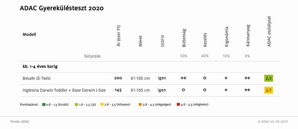 Egytől négyéves korig, vagyis 61-105 centiméterig használható ülésből kettő szerepelt a teszten. Fontos, hogy ezek már nem megfelelőek a legkisebbek, vagyis az egyéves kor alattiak számára. A Besafe iZi Twist megelőzte az Inglesina termékét – utóbbi közepest kapott.