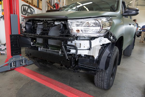 Itt a jármű használatához méretezve építik be az új rugókat, a lengéscsillapítókat, attól függően, mekkora terheléssel számolnak, kell-e emelés. Itt minimális volt az emelés, így például a kardánhoz nem kellett nyúlni, de a kint álló Hiluxok már nem igazán gyárinak néznek ki, így azoknál már ahhoz is hozzá kellett nyúlni, jó 14 centivel van magasabban az autó. A futómű alá nem csak úgy behajigálják a dolgokat, minden ki van számolva, az alkatrészek mind beépítési engedéllyel rendelkeznek (ez azért itthon nem olyan gyakori).