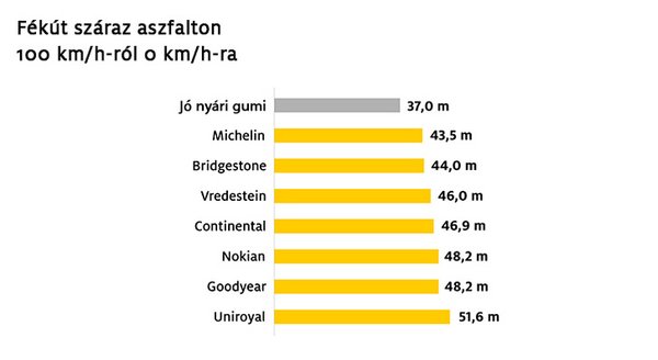 Az eredményeket érdemes differenciáltan vizsgálni. Ez segít ugyanis abban, hogy mindenki a saját használati szokásaihoz tudja mérni az adott abroncs tulajdonságait. Az első szempont a száraz aszfalton mért tapadás. Természetesen ez is egy több összetevős teszt, amelyben szerepel kikerülési feladat, handlingpálya és sok más próba. A németek az egyik legpontosabban mérhető mutatót emelték ki az alábbi infografikára: a fékutat. Referenciaként egy jó minőségű nyári gumit is megmértek (nem nevesítették, hogy melyiket), és ez az abroncs meg is nyerte az összevetést. Hat és fél méterrel előzte meg a legjobb négy évszakost, a Michelint. Az Uniroyallal 14,6 méterrel nőtt a fékút, ami arányaiban is hatalmas különbség.