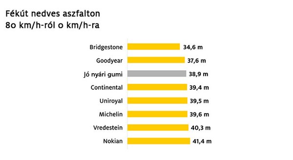 Nedves aszfalton viszont teljesen eltűnt a nyári gumi előnye: a Bridgestone és a Goodyear négy évszakos mintázata meg is tudta előzni, de a többiek is a közelében voltak. A szárazon elvérző Uniroyal egy méteren belülre zárkózott.