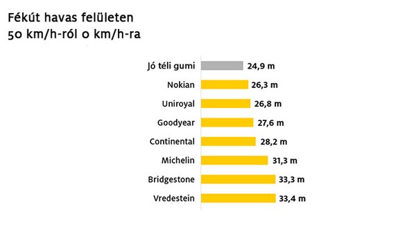 A télies teszteken a referenciát természetesen egy jófajta téli gumi jelentette, ahhoz mérték a négy évszakos változatok teljesítményét. Havas úton egyik sem tudta lenyomni, legközelebb a sokszor télspecialistaként emlegetett Nokian került hozzá, pontosabban másfél méteren belülre. Itt is voltak azonban nagyon jelentős lemaradások.