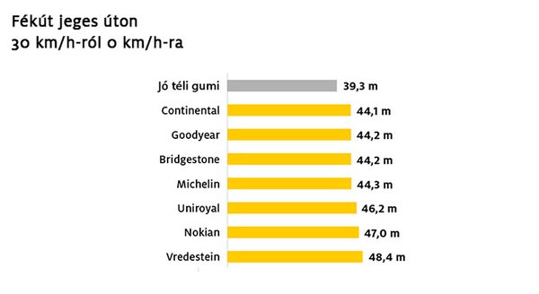 Majd jött a jég. Ilyen burkolatra nem nagyon lehet felkészülni, gyakran mondják, hogy jégre nincs jó gumi, érdemes inkább elkerülni. Persze a fékutakat össze lehet hasonlítani itt is: megint a téli gumi győzelmét látjuk. A négy évszakosak közel ötméteres távolságból követik, de a sereghajtók ennél is jóval gyengébben muzsikáltak.