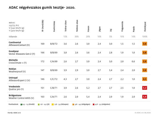 Az alábbi táblázat az összesített végeredményt mutatja, de éppen a korábban már leírtak miatt érdemes fenntartásokkal kezelni a sorrendet, és elmélyülni a részletekben. Az értelmezéshez fontos adalék, hogy amennyiben egy gumi valamely fontos részértékelésnél elvérzik, az az osztályzat meghatározza a végeredményét is - ez az ADAC tesztjeinek sajátossága.