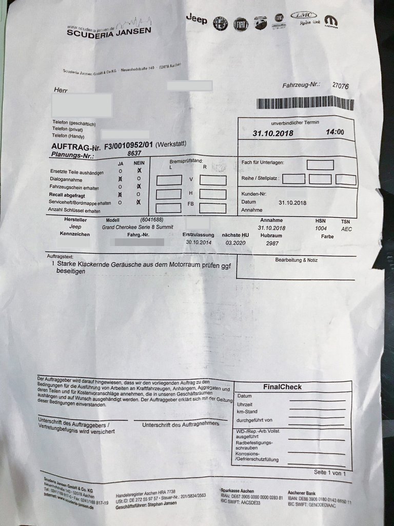 Anna és férje Németországban, 2018-ban, márkakereskedésben vásárolta meg autóját, egy 2014-ben gyártott Jeep Grand Cherokee 3,0 CRD-t, vagyis a közepes méretű terepjáró dízelmotoros változatát. Mint levelében írja, a négyéves autóban akkor mindössze 30 ezer kilométer volt, vagyis újszerűként vették birtokba, majd fél éven belül mentek vele további húszezret, mert sokat utaznak. Ezt a Jeepet attól a hivatalos márkakereskedéstől vásárolták, amely újként eladta az előző gazdájának és bár sokszor nem kellett karbantartásra vinni, azokat is mindig ugyanott végezték el korábban a Jeepen.