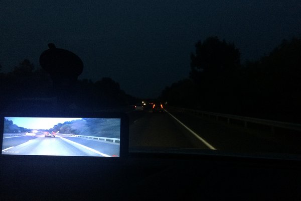 Az éjjellátás kb olyan, mint a korábbi modellen, esős időben, kop sötét országúton jól tud jönni, városban néha kicsit túltolja, és a féklámpák fénye deríti vörösbe a képernyőt. Mondjuk praktikusan városban lekapcsolhatjuk a kijelzőt, így nincsenek a zavaró tényezők.