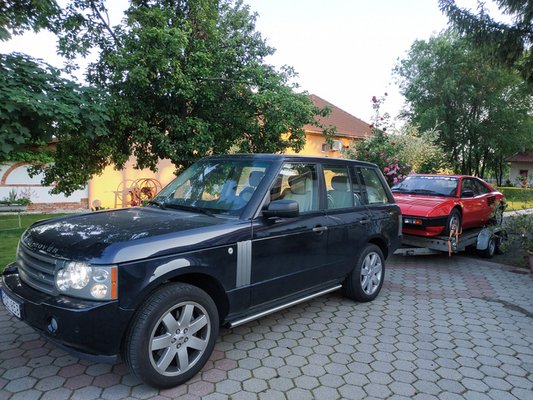 Péter, ennek a 2007-es TDV8 jelzésű Range-nek a gazdája már szerepelt korábban az Erőmérőben, mégpedig a századik adásban a Ferrari Mondiallal. Az alábbi fotón a korábbi szereplőnket szállítja utánfutón a nemes vérű angol terepjáró.