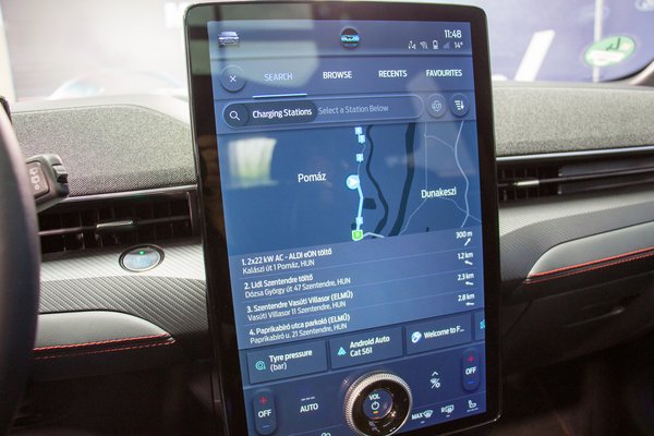 A navigációt is megjelenítő fedélzeti rendszer lelke egy központi elhelyezésű, 15,5 col átlójú érintőképernyő. Nekem úgy tűnt kissé meredeken áll, el is gondolkodtam rajta, mi lenne, ha állíthatóan építenék be az autókba. Mivel minden erről kezelhető, ráadásul egy gyorsan kitanulható menürendszeren keresztül, ezért műszeregységre szinte nincs is szükség. (Mint ahogy például a Tesla Model 3-asban nincs is.) Azért a Fordnál nem ennyire kegyetlenek, egy kis LCD-s kijelző azért ott virít a kormány mögött.