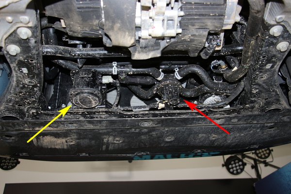 Koaxiális felépítése miatt ezt a motort is a kerekek közé süllyeszthették, tulajdonképpen az első segédalváz aljára erősítették. A segédalváz felső részére a töltőelektronikát telepítették, ennek tetején kapott helyet a motorvezérlő elektronika. Vagyis ez nem egyesített rendszer, mint a hátsó, hanem elkülönített, ami szintén a GKN már említett megoldását jellemzi. A vezérlőelektronika mellett egy egyenáramú, DC-DC átalakító ül, ez tölti árammal a 12 voltos akkumulátort, amire a továbbra is számos 12 voltos elektromos berendezés miatt van szükség.