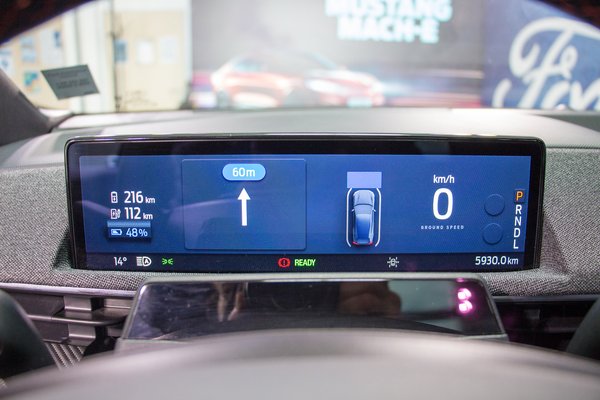 Ami furcsa elsőre, hogy nem változtathatóak rajta a kijelzett információk. Azt mutatja, amit, és kész. Olyan érzés, mintha a head-up-display helyett építették volna be, még a kijelzett adatok is hasonlók. Bár ebben a kategóriában a szélvédőre vetített kijelzés eléggé elfogadott, a Mach-E-ből ez talán azért maradt ki, mert elég nagy a helyigénye. Kiviteltől függően akár 10-15 liter is lehet, ami egy műszerfal esetében nem kevés. Talán, ha nem lenne ott a klímarendszer.