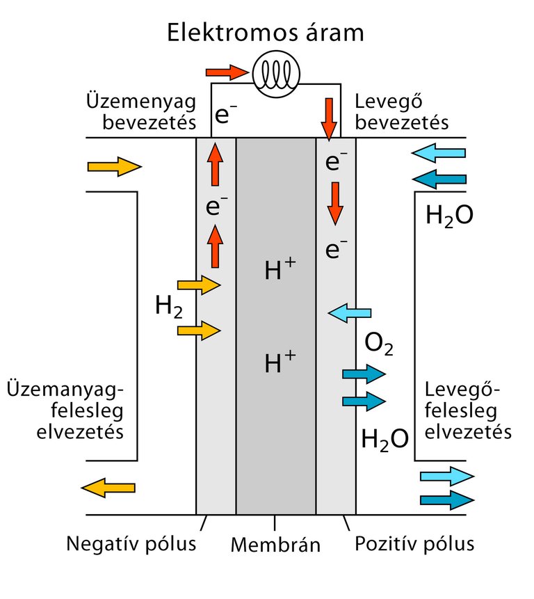 Működése nagy vonalakban a következő: az üzemanyagcellába körülbelül környezeti nyomáson hidrogéngázt vezetnek, ami egy platinaötvözettel bevont, negatív elektródára érkezik. A katalizátorként működő platinaötvözet arra kényszeríti a hidrogént, hogy leadja a negatív töltésű elektronját, ami az elektródán keresztül megindul a fogyasztó, jelen esetben az elektromotor felé. A pozitív töltésű hidrogén ion áthalad egy speciális (ionáteresztő) membránon, és megérkezik a szintén katalizátorral bevont pozitív elektródához, amelynek a másik oldalára körülbelül 1,7-2 bar nyomással levegőt fújatnak. A pozitív töltésű hidrogén ion itt egyesül a levegő oxigénjével és eközben felveszi a pozitív elektródán a fogyasztótól érkező elektronokat (az áram nem más, mint elektronok áramlása). A hidrogén és az oxigén egyesülésekor vízpára keletkezik, ami a kipufogócsövön keresztül távozik. De semmi más ezen kívül!