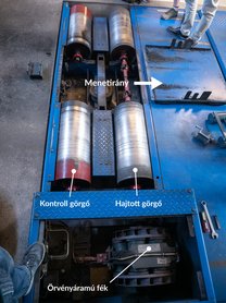 A görgők is kettősek, a kerekek a két görgő közé ülnek be. Az első görgő a hajtott, erre akar „felmászni” a kerék, míg a hátsó a kontrollgörgő: ez szabadon fut. Ha nem érne hozzá a kerék, vagy az első megcsúszna, akkor a két görgő fordulatszáma eltér és mindjárt kapunk egy hibaüzenetet, hogy hibás a mérés. Ekkor kell tapadást javítani, vagy mint emlékezhettek: súlyokat tenni a csomagtartóba, esetleg még embereket ültetni a hátsó ülésre.