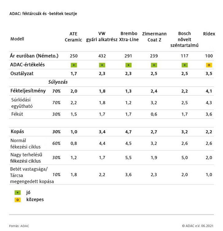 A cikk végén található táblázatban szereplő árak euróban értendők, és a komplett szettre, azaz az összes első-hátsó tárcsára és betétre vonatkoznak. Mivel az ADAC tesztjében pontos cikkszámokat nem adnak meg, így ezek hazai árát nem is kerestük ki a magyar webshopokban, hiszen az torzítaná az arányokat.