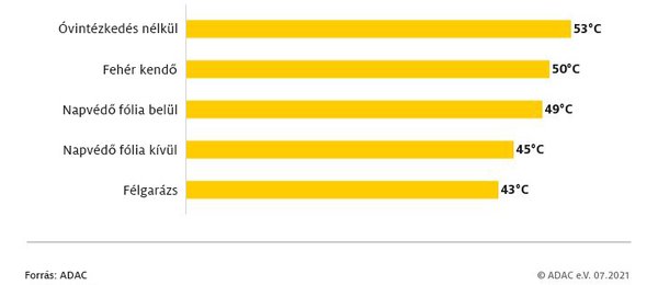 A legjobb, ha árnyékos helyet keresünk, de ez egyrészt nem mindig lehetséges, másrészt pedig, ha hosszabb ideig parkolunk egy helyen, könnyen lehet, hogy mire újból autóba ülünk, egészen más szögből tűz rá a nap a kocsira. Ezért nem árt legalább a műszerfalat és a kormányt letakarni. A fentiekben bemutattuk ugyanis a levegő belső hőmérsékletét, de a felületek még forróbbak lehetnek. A teszt során például a kormányon is 70 Celsius fokot mértek. Ez bizony akár égési sérüléseket is okozhat, de legalábbis kellemetlen rámarkolni. Ha még van egy szép sötét bőrülésünk is, pillanatok alatt sortársunknak érezzük Dózsa Györgyöt.