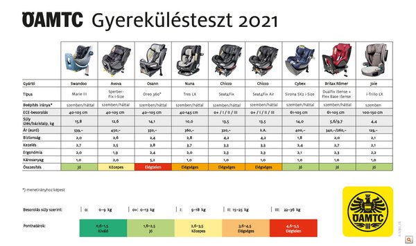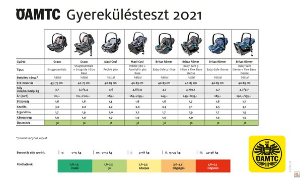 Az első táblázat a kisebb gyermekeknél használható üléseket mutatja. Jó hír, hogy végül mindegyik termék megkapta a jó osztályzatot, de azért az látszik, hogy vannak különbségek. A legfontosabb szempont természetesen a biztonság, ebben az összevetésben pedig a Maxi-Cosi Pebble 360 szerepelt a legjobban, a maga 1,3-as értékelésével. Az indoklás szerint nagyon alacsony sérülésveszélyt figyeltek meg mind frontális, mint oldalütközés esetén, a rögzítés stabil, az övek jól futnak.