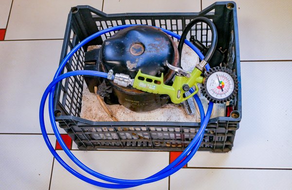 Aztán sajnos örököltem apukámtól egy általa készített biciklifújtató kompresszort. Ez valójában egy hűtőgépkompresszor, szóval nem kifejezetten hordozható méret és 220 voltról működik.