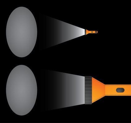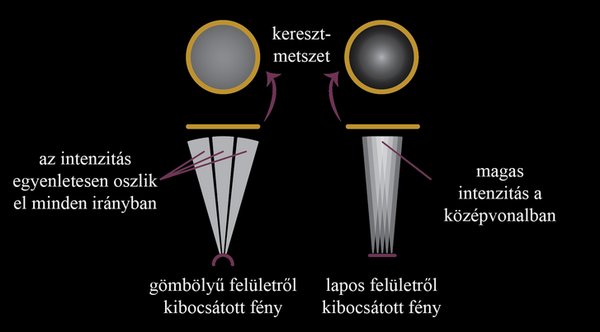 A kérdések mindegyikére a válasz a két fényforrás térbeli intenzitás-eloszlásának különbségében keresendő. Vessünk tehát egy pillantást arra, hogy hogyan terjed tova a fény a térben az egyik, illetve másik esetben. Ha a fényforrás felülete gömbölyű, a fény minden irányban egyenletesen terjed. A kibocsátott fény gyakorlatilag egy egyre táguló gömb, így az, hogy egy pontban mennyi fényt találunk, kizárólag a forrástól mért távolság (négyzetes) függvénye. Ebbe a típusba tartozik az összes égitest (például a Nap), a halogén, a neoncső, a fémhalogén források, a satöbbi.