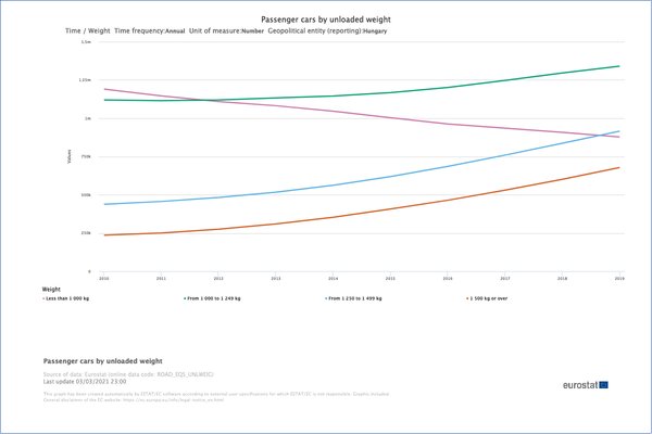 Kerestem hozzá statisztikát is. Az Eurostatnak vannak erről számai, és a kép kevéssé meglepő: hiába rohadt öreg az autóparkunk, tíz év alatt a legkönnyebb autók száma monoton csökkent, miközben a másfél tonna felettieké kétszázezerről hétszázezer közelébe ment fel. Több mint háromszorosára. Egy olyan csóró országban, mint ez. Képzeld a németeket! A két tonna feletti személyautókra nincs külön statisztikai kategória, de ha volna, az lenne arányaiban a legcifrább, az biztos.