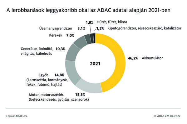 Az ADAC már korábban nyilvánosságra hozta a leginkább jellemző hibaforrásokat. Sokakat talán meglephet, de nem kimondottan a nagy, költséges meghibásodások vezették a listát. Közel 50 százalékban az akkumulátor hibája miatt áll meg, vagy értelemszerűen be sem indul az autó. A motorral, motorvezérléssel kapcsolatos hibák ennek töredékét, 15,5 százalékot tesznek ki, ebbe a gyújtás és a befecskendezés anomáliái is beletartoznak.