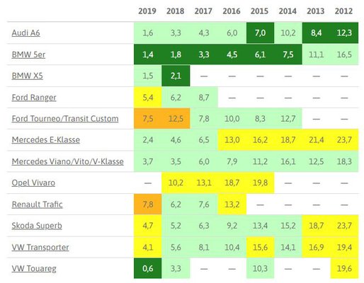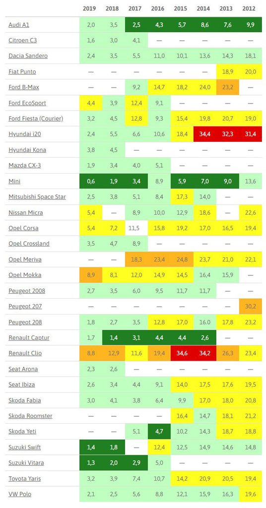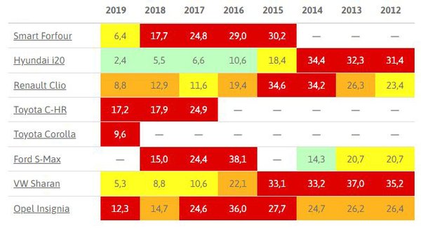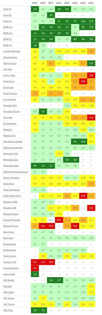 A táblázat értelmezése: a fejlécben az évjáratokat találjuk, 2012 és 2019 között gyártott autók szerepelnek az idei kimutatásban. A színes rovatokban azt látjuk, hogy ezer olyan jármű közül mennyi hibásodott meg, pontosabban mennyihez hívták segítségül a német autóklub szakembereit. Értelemszerűen: minél nagyobb a szám, annál zűrösebb volt a típus. A piros háttérszín a legproblémásabbaknak járt, eggyel alattuk a narancssárga, majd a citromsárga, a legjobbak, legmegbízhatóbbak zöldet kaptak. A ponthatárok évjárat szerint változnak, az értékelés engedékenyebb az idősebb kocsikkal, szigorúbb a fiatalabbakkal.