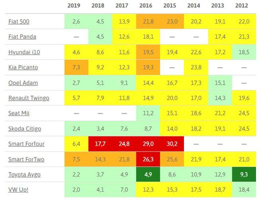 Az eredmények tehát kategóriánként külön táblázatban szerepelnek. Az A szegmensben, vagyis a szuperminik között a már említett Smart Forfour volt tehát a legproblémásabb, de a Fortwo sem előzte meg olyan sokkal. Kizárólag zöld rovatokat látunk viszont a Toyota Aygo mellett, a városi törpék közt tehát kimagaslóan megbízhatónak számít a Citroën C1-gyel és Peugeot 107-tel azonos platformra épülő japán.