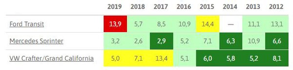 Bár az előző kategóriákban is fel-feltűntek kisbuszok, furgonok, kimondottan különvéve három áruszállítót sorakoztatnak fel. Ezek közül nevezhetjük bronzérmesnek a Ford Transitot: a legfrissebb vizsgált évjárat, a 2019-es rovatában piros színt látunk, a 2015-ösben sárgát.