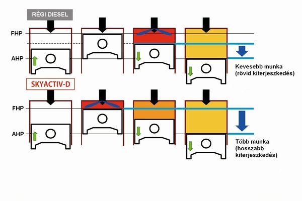 Érdemes talán megnézni, hogyan oldotta meg a feladványt két, a dízelmotor fejlesztésben vezető és nagy múlttal rendelkező német autógyártó. A BMW és a Mercedes a szintén hathengeres és hasonló lökettérfogatú (háromliteres) dízelmotorjainál, a B57-esnél, illetve az OM 656-osnál a Mazdáéhoz hasonló, az ideálist közelítő furatot (84, illetve 82 mm) és hosszú löketet (90, illetve 92,4 mm) alkalmaz. A kisebb koromkibocsátást célzó égéstér kialakítás mindkét motor dugattyúján megfigyelhető, különösen a Mercedesén, amely a képek alapján nagyon hasonló a Mazda lépcsős kiképzéséhez. A Mercedes dugattyúja annyiban érdekesebb a BMW-énél, hogy az alumínium blokkban futó dugattyú acélból készül, ami nagyobb teherbírás mellett könnyebb, mintha alumíniumból készült volna.