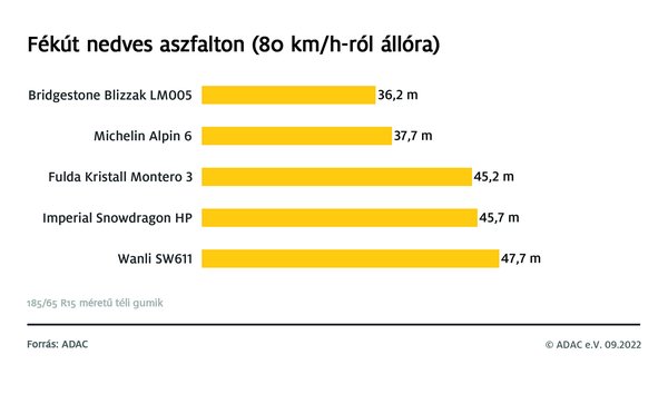 Nedvesen minden megváltozott, az Imperial és a Wanli teljesen elvérzett: míg a fékezéses feladat legjobbja, a Bridgestone 36,2 méteren állította meg 80 km/h-ról a tesztautót, az Imperialnak 9, a Wanlinak 11 méterrel többre volt ehhez szüksége. Másképpen szólva: ha a Bridgestone-nal még pont megállunk a gyalogos előtt, a Wanlival 39 km/h-s tempóval vasaljuk ki.