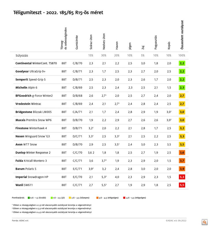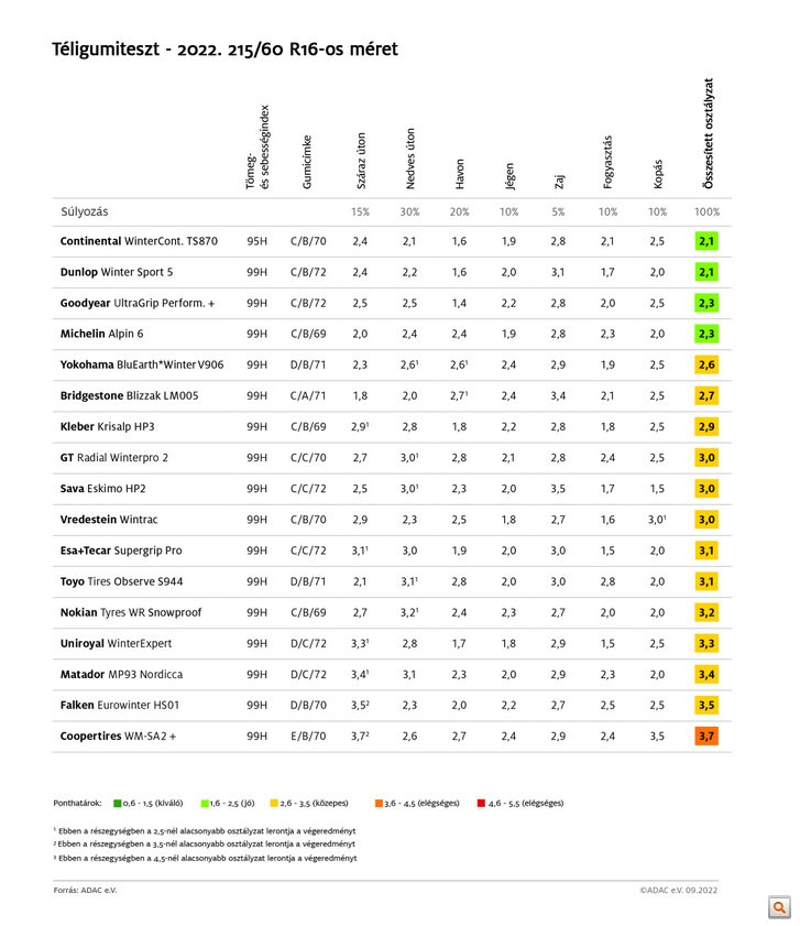 Az eddigiekben egyszer sem írtuk le a Continental és a Goodyear nevét, az összesítő táblázatban mégis ezek vannak az élen, rajtuk kívül a Semperit kapott még 2,2-es végső osztályzatot. 2,3-mal a Michelin fért még be a jó minősítésűek közé. Ez azért lehet, mert az ADAC számára mindennél fontosabb a kiegyensúlyozottság, ebben pedig ezek a gumik voltak verhetetlenek, bár egy-egy részfeladatnál akadt náluk jobb. Megbukott viszont az Imperial Snowdragon HP és a Wanli SW611 – ezeket nyomatékosan kerülendőnek nevezik a németek.