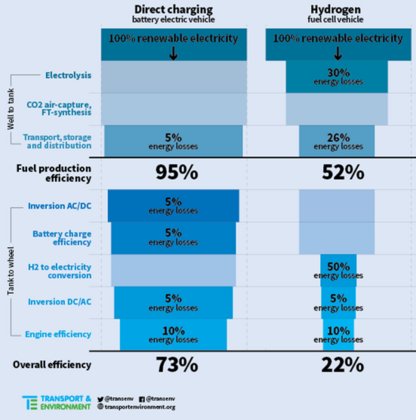Vagy másképpen: adott mennyiségű megtermelt energiából vajon több mint 3 kilométert szeretnék megtenni, vagy inkább csak egyet? Ugyanis energiakihozatal tekintetében az akkumulátoros technológia több mint háromszoros teljesítménnyel bír. (Matek: 73 százalék megmaradt hasznos energia több mint háromszorosa a megmaradt 22 százalék energiának.)