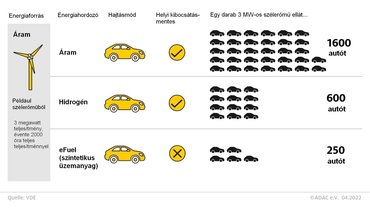 A szintetikus üzemanyagok esetében a problémát azonban nem a szén-dioxid-kibocsátás, hanem az előállításukhoz szükséges energiabefektetés jelenti a tanulmány szerint. Míg a 240 000 kilométeres futásteljesítményre vetítve például az árammixes árammal etetett elektromos autó 0,59 kWh energiát emészt fel átlagosan kilométerenként, a szintetikus dízel üzemanyaggal hajtott autó akkor is 1,26 kWh-t igényel kilométerenként, ha az eDiesel előállításához a szén-dioxidot biomasszából, a hidrogént pedig megújuló erőforrással, vízbontásból nyertük. Ha a szén-dioxidot a levegőből vonjuk ki, az energiabefektetés még több, 1,74 kWh/km. De a legérzékletesebben talán mégis a VDE és az ADAC alábbi ábrája mutatja, hogy adott mennyiségű energiát melyik hajtásmóddal lehet a legjobban kihasználni. Ezzel együtt egyes iparági szakértők szerint elektromos hálózattal nem rendelkező, ugyanakkor megújuló erőforrással gazdagon ellátott, elszigetelt és nagy kiterjedésű területeken hasonlóképp szerephez juthat, mint a hidrogén.