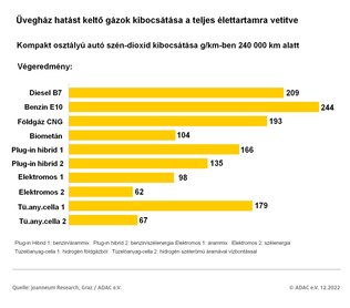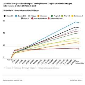 Valójában a teljes élettartamra vetített szén-dioxid-kibocsátásban nem született meglepetés. A 240 000 kilométer alatt összességében a benzinüzemű autó eregette a levegőbe a legtöbb (59,6 tonna) a Föld felmelegedéséért elsősorban felelőssé tett gázt, a legkevesebbet pedig az elektromos és a hidrogénes tüzelőanyag-cellás. De máris nem ilyen egyszerű a helyzet, hiszen az utóbbi kettő csak akkor hoz szinte egyformán alacsony értékeket (16,7, illetve 17,3 tonna), ha a használatuk során felhasznált energia teljes egészében megújuló energiaforrásból, például szélerőműből származik. Abban a pillanatban, ha az áramot egy adott ország (jelen esetben Németország) különböző erőműveinek összessége állítja elő (árammix), akkor már nem ennyire kiemelkedően jó, de még mindig kedvező az elektromos típus szén-dioxid termelése: 29,3 tonna. Ennél sokkal jobban megemelkedik a hidrogénes tüzelőanyag-cellás autó kibocsátása, ha a hidrogént a ma legelterjedtebb módon, földgázból állítjuk elő. A 240 000 kilométeres futásteljesítmény végére 44,3 tonna szén-dioxid jut a levegőbe, ami azonban még mindig jobb, mint a benzines (59,6 t), a dízel (51,3), vagy a földgáz hajtású autó (47,4 t) összkibocsátása.