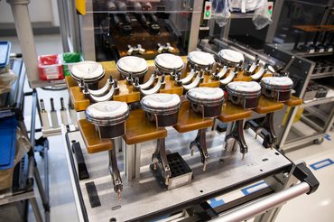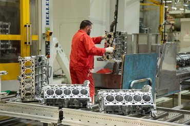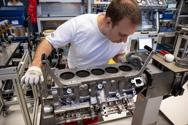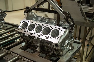 Ha a vízhűtéses mechanikai fázisnak vége, az összeszerelés ügyesen ütemezve, a folyamatokat pontosan követve és a munkatársakat kellően rotálva történik. Négy láncból áll a vezérlés, a vezérműtengely mindig tökéletesen csúszik a csapágyutcába, az olajszivattyú pedig nagy, hiszen hengerpáronként kezeli a szárazkarteres kenést. A hengerfej csavarjait gép húzza meg, mely sosem véti el a megadott nyomatékot.