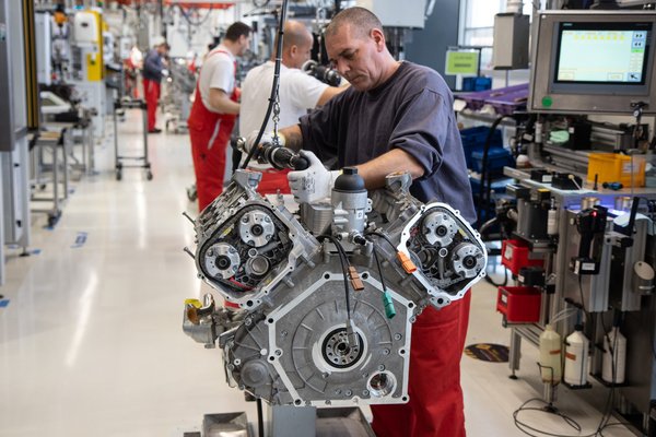 Mióta az Audi Hungaria nem szállítja már a V8 TDI motort, az öthengeres turbós és a két V10-es szívómotor verzió is az exkluzív nagyteljesítményű gyártósoron készül. A motor útja 64 méter hosszú kis dokkoló állomásokkal, robotok nélkül. Automatizálás helyett a V10 megalkotásához 29 legalább tízéves tapasztalattal rendelkező munkatársra van szükség, húsz és fél műszakban a hét minden napján, vasárnap délután négy órányi leállással. Egy motor fél órán át készül, így napi 24 az Audi Hungaria átlaga.