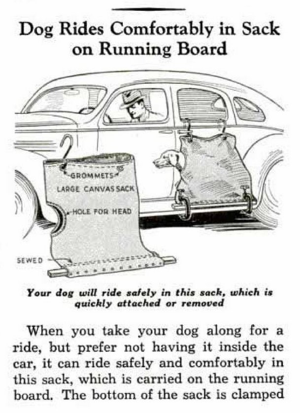 Ez a teljesen abszurd találmány a Popular Mechanics nevű magazin egyik 1936-os számában tűnt fel, megálmodója sajnos ismeretlen. A felül nyitott zsákot gumibevonatú fémkampókkal lehetett az autó oldalához rögzíteni, a kutyus pedig a zsák elején kialakított lyukon keresztül még nézelődni is tudott menet közben. A hirdetésben szereplő ígéretek szerint a kutyazsák amellett, hogy néhány pillanat alatt fel- és leszerelhető, még „biztonságos és kényelmes" is az állat számára.
