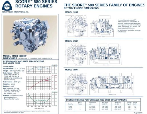 Az RPI-t is az a három tulajdonsága fogta meg a Wankel-motornak, ami miatt sokan kitartottak mellette: a kis mérete, az egyszerűsége és a kiváló súly/teljesítmény aránya. A vállalat a fejlesztést még a '90-es évek végén kezdte el és 2000 augusztusára kész motorral állhatott a nyilvánosság elé. Megszületett az 580 Series első tagja, a 2116R, ami egy 11,6 literes, turbós, kétrotoros egység volt 1000 lóerővel és 2102 Nm forgatónyomatékkal a főtengelyén. A csúcsteljesítményét 3600-as, a nyomatékot pedig 2400-as fordulaton érte el, így még nagyon pörgetni sem kellett, hogy érdemi ereje legyen.