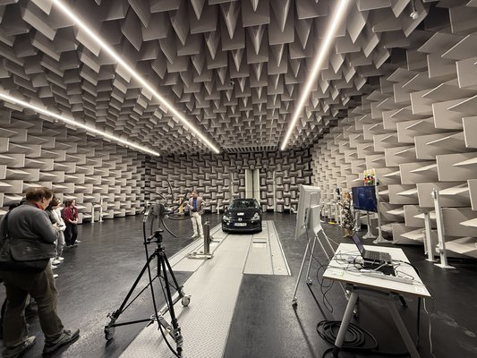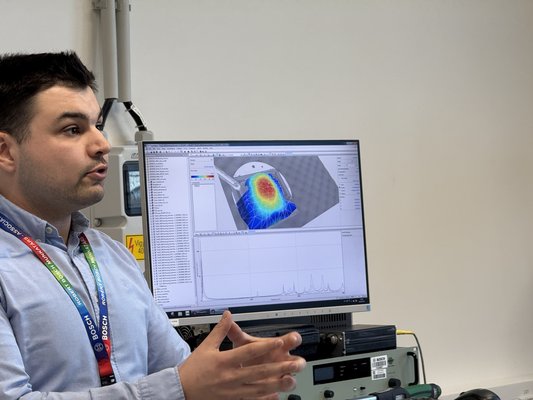 Az autóval szemben elhelyeztek egy speciális kamerát, ami a kép mellett hangot is vesz és képes lokalizálni a hang forrását. Működés közben könnyedén kiszűri a legapróbb rezgéseket is, így a mérnökök mindig tudják, hogy hova nyúljanak, hol kell elcsendesíteni, esetleg precízebben rögzíteni az adott alkatrészt. Emellett képesek mérni a komplett autó elhaladási zaját is. Sokan nem tudják, hogy az EU-s típusengedély kiállításához egy autónak ezt a próbát is ki kell állnia és hanghatáron belül kell maradnia. Régen ezt úgy mérték, hogy kimentek egy reptérre néhány precíz mikrofonnal, de itt sosem volt zajoktól semleges a háttér. Így ezt a mérést ma már olyan laborokban végzik, mint amilyen a Bosch-nak is van itt Budapesten.