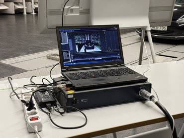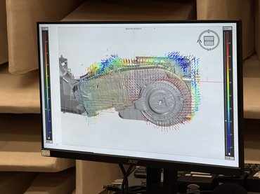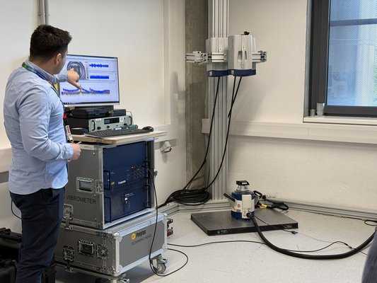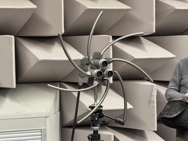 Átvittek minket az Akusztikai és Rezgéslaborba, ahol a különböző alkatrészek rezgését mérik lézer-vibrométerek segítségével. Egyszerre több száz lézernyaláb tűz az adott egység felé, ami működés közben szabad szemmel láthatatlan rezgéseket bocsát ki. A műszer a visszaérkező jelek alapján kiszámolja a test mozgásának mértékét, ezekből az adatokból pedig a számítógép kialakít egy rezgéstérképet. A mérnökök szerint minden formának és testnek más-más rezgéstérképe van, de csak ezek alapján tudnak elindulni afelé, hogy minimalizálják vagy kioltsák a finom mozgásokat.