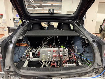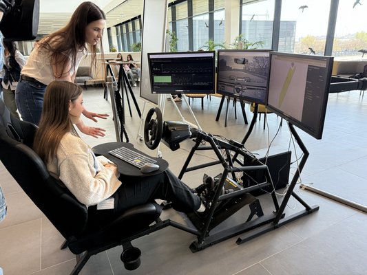 A kampusz emeletén található autós szimulátor egy pedálboxból, egy kormányból, egy vezérlőből és három monitorból áll. A különbség itt annyi, hogy a középső monitoron nem egy autós játék jelenik meg, hanem egy igazi autóra szerelt kamera képe. A szimulátor ugyanis egy a Bosch tesztpályáján mozgó autót irányít, közöttük pedig 5G mobilhálózaton keresztül jön létre a kapcsolat.