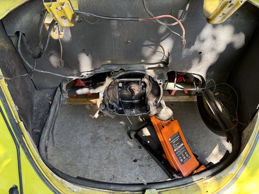 Ideje levenni a motort. Ez nem tűnt olyan nagy feladatnak, hiszen a Bogár motorja lényegében lebeg a kaszniban. Nem tartozik hozzá tartóbak, csak a váltóhoz fogja hozzá négy csavar, a váltó pedig három vaskos gumibakon áll. Elvileg kitekerem a csavarokat, leengedem a motort és kihúzom alul. Ilyen egyszerű, nem? Nem.