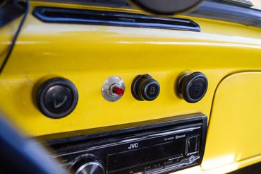 A régies darálásra a műszercsoport egyetlen órájának elefántcsontszínű mutatója heves lebegésbe kezd. Az alsó tartományokban ember legyen a talpán, aki megmondja, hogy mennyivel megy az autó, 30 felett azonban lecsillapodik, a 80-90-et pedig már egészen minimális rezgés mellett mutatja – imádom. Kettőt klattyan kifelé húzva a fém műszerfal tetején elhelyezett gomb, ez volt a tompított fényszóró. Tőle balra egy rejtélyes gomb, ami semmit nem csinál – valószínűleg egy régi riasztóhoz tartozhatott – még odébb pedig az utólagos piros kapcsoló az ablakmosó folyadék szivattyújához tartozik.