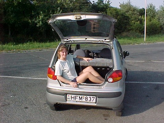 Matyi egyik pilótájának, a képünkön a 104 literes 8-) csomagtartóban (melynek tetejét a Punto II-höz hasonlóan a PUSZTA LEMEZT megfogva emelhetjük fel) helyet foglaló fiatalasszonynak arra a kérdésünkre, mi a zavarja a gépben, csak hosszas gondolkodás után sikerült két dolgot megemlíteni. Mindkettő elmegy dicséretnek is. Nr. 1: csak egy pohártartó van a középkonzolban. Nr. 2: a vezetőoldali napellenző piperetükre nem takarható el, éjszaka néha zavaró lehet, hogy a Nap ellen védekezve szemünkbe süt a minket követők fényszórója.