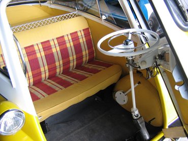 Az idilli környezetbe az autó előre, felfelé nyíló elején át lehet beszállni. Az idők során kissé meggyengült az ajtót tartó rugó, nem árt, ha a beevickélés során az ajtóval előremozduló kormánykereket (mint a mai luxus-BMW-kben, ugye?) tarjuk, míg be nem érünk az Isetta kuckójába. Az ülés kényelmes, tartása persze értelemszerűen nincs. A vezetési pozíció fix és minden nagyon közel van, igazi dodzsemes érzés. Az oldalablakok eltolhatók és minden Isettát hátrahajtható ponyvatetővel szereltek, így a gyors átszellőztetés garantált és könnyebb is visszaintegetni az utca elragadtatott népének.