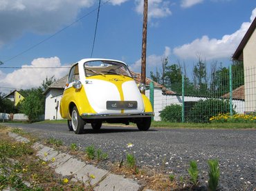 Ez valami csudaszép. Kívül semmi műanyag, csak domborított lemezek, krómozott lökhárítók, BMW-emblémával nyomott krómdísztárcsák, mókás lámpák, megannyi, szeretettel tervezett iparművészeti remek. A tesztautócska rekonstrukciós festése kevéssé korhű, de nagyon szép és vidám, a sárga-fehér kontraszt pedig szépen kiemeli az Isetta orrán a stilizált tangabugyit. A külső poggyásztartó rács gyári tartozék, elég masszívnak tűnt ahhoz, hogy ennél fogva akár fel is lehessen emelni a 350 kilós kisautó hátulját.