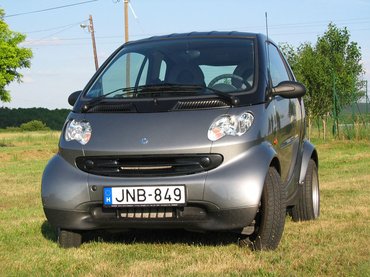 Kívülről ez is helyes, csinos kis állatka. Sajnos szürkében kaptuk, de még így is elég vicces, sőt, hetykén fickós látványt nyújt a Smart. Jól áll neki az Isettával pont ellentétes építési koncepció: széles hátsó nyomtáv 175-ös, 15 hüvelykes kerekekkel - szűk mellső, kisebb, 145-ös gumikkal. Kis dragster. Vizes úton úgy is viselkedik, hiába minden ESP, simán eltolja az orrát, ha nagy tempóval szeretnénk hirtelen bekanyarodni valahova. Meg ha kis tempóval, akkor is.