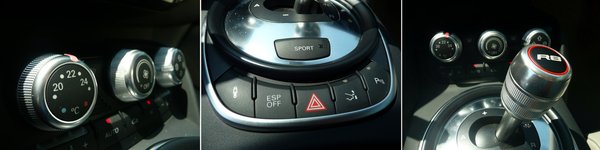 A beltér nem olyan fekete lyuk, mint a Porschéké; a műszerfal sötétszürke (ami valójában nagy különbség a feketeséghez képest), a szőnyegek világosszürkék – jó, technó, audisan sportos. Fém van bőven, de az se króm, hanem szálcsiszolt alumínium, jól is néz ki.
