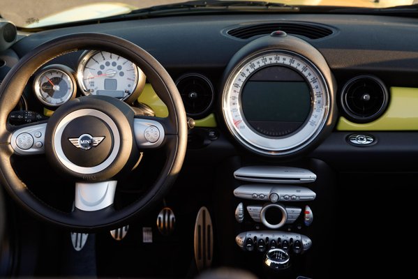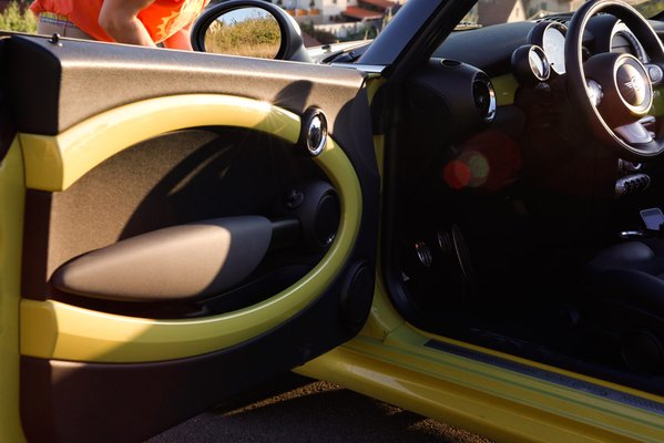 A kabrió változat egészen az idei detroiti autószalonig húzta, de természetesen ez is tök más autó, mint az ugyanilyen elődmodell. A formájával kapcsolatban az gondolkodtatott el, hogy ha nem látom, csak személyleírást kapok róla, nem tudom elképzelni, hogy nézhet ki jól. Az orrán például kicsit sok is az ismertetőjel: levegőbeömlő a géptetőn, két fekete, fehér szélű dekorcsík, szárnyas Mini-embléma, erősen tagolt fényszóró vaskos krómkerettel, hasonló hűtőmaszk, ködlámpák, vastag fekete kerékívek, rajta arasznyi narancssárga prizmák, csicsás műkróm rátétes oldalindexek, és persze mindez UV-banánzöldben. Csúnyán hangzik, ugye.