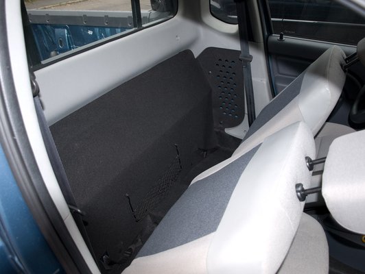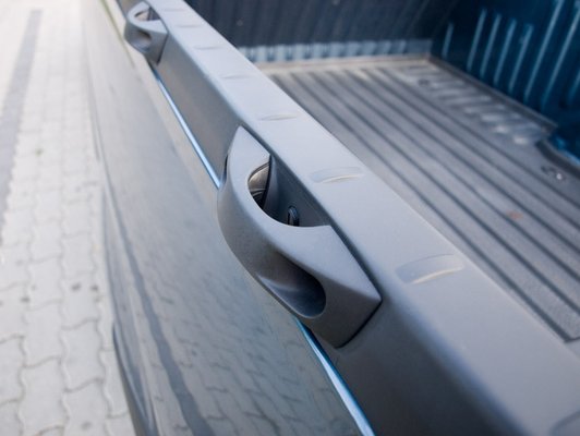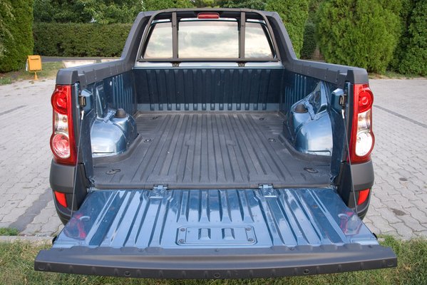 Hátul találunk hat, a darabos áru elszabadulását megakadályozandó rögzítőszemet a padlón, amire felkerült a szokásos csúszásgátló gumi, plusz a plató oldala is végig van rakva rögzítőfülekkel. A betüremkedő kerékjárati ívek kicsit aszimmetrikusak, mivel az MCV-örökség miatt a jobb oldalon kellett a hely az üzemanyag-betöltő csőnek. A plató ajtaja jó súlyos darab lett, strapabírónak tűnik, viszont a lökhárító miatt csak vízszintes helyzetig lehet lehajtani. A hirtelen előrelendülő árut egy vaskeret hivatott megfékezni, bár csak két keresztrudat raktak bele, így középen még mindig beköszönhet valami karcsúbb tárgy az utastérbe. A védőkeret tetején létra, vagy egyéb, a platónál hosszabb tárgy szállítása esetén kihajthatunk két fület, ami a rakomány oldalirányú szabadságvágyát fogja vissza valamelyest.