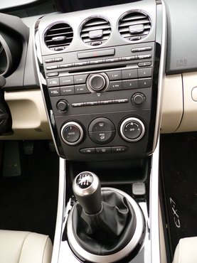 Számomra felszereltségi furcsaság, hogy rendelhető a CX-7-hez hatlemezes CD-váltó, hiszen minek, amikor hat MP3 fájlokkal teleírt CD tartalma is simán elfér egy jobbfajta pendrive-on. Volt énnekem CD-váltóm, 2001-ben, a Golfomban, gyűlöltem. Látszólag ugyanis jó, hogy van betárazva hat lemez, de ha valami konkrétat hallgatnék, már úgyse emlékszem, hová raktam a Slayert. És akkor végignyomkodjuk a tárat, egyik lemez kivesz, másikat berak, lassan elindul, nem ez az, kivesz, következő berak, és már nem is emlékszem, mit akartam hallgatni. Szóval nagyra értékeltem volna, ha van alapban egy beépített USB-madzag, mint mondjuk a KIA Soulban.