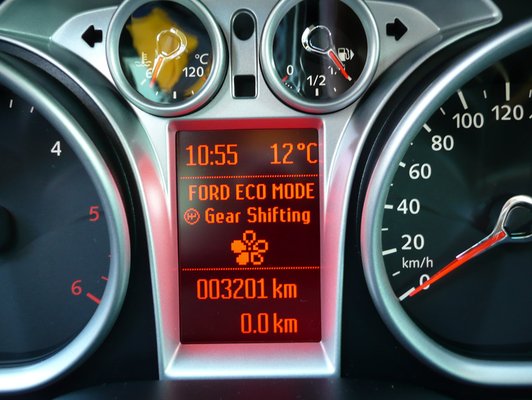 A Ford Econetic pedig a Honda Insighthoz hasonló ökoterrorral próbálja elvenni a kedvünk – na nem az autózástól általában, csak attól, hogy örömünk leljük benne. A kilométeróra kijelzője három kategóriában pontoz minket. Az egyik ikon a váltóhasználatot értékeli, váltókulissza a jele. A másik az előrelátást, amit két kuglibábu jelenít meg, persze távcsőnek van szánva, hiszen arra utal, hogy előrelátó módon idejében léptünk le a gázról, és általában sokat használjuk a motorféket.